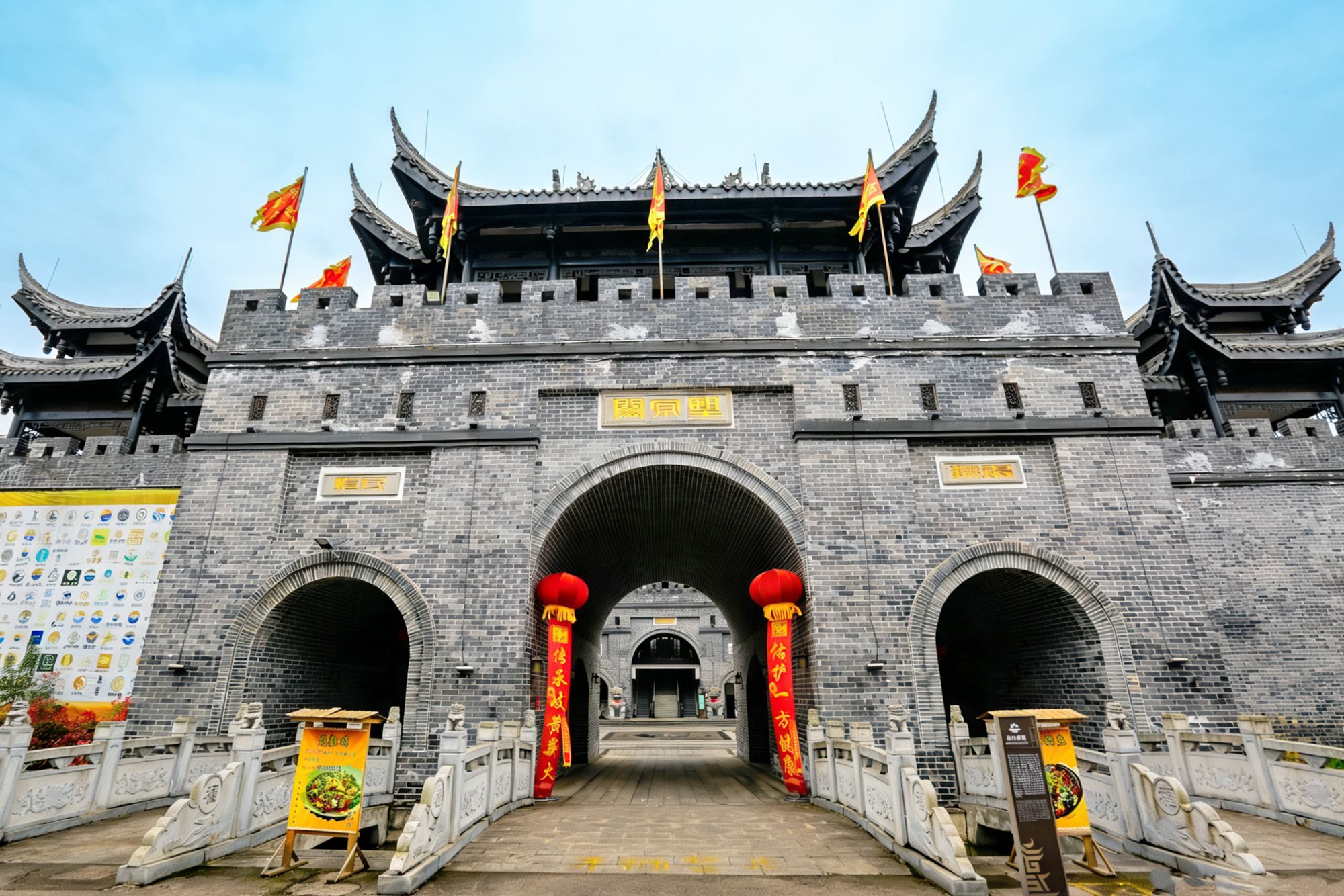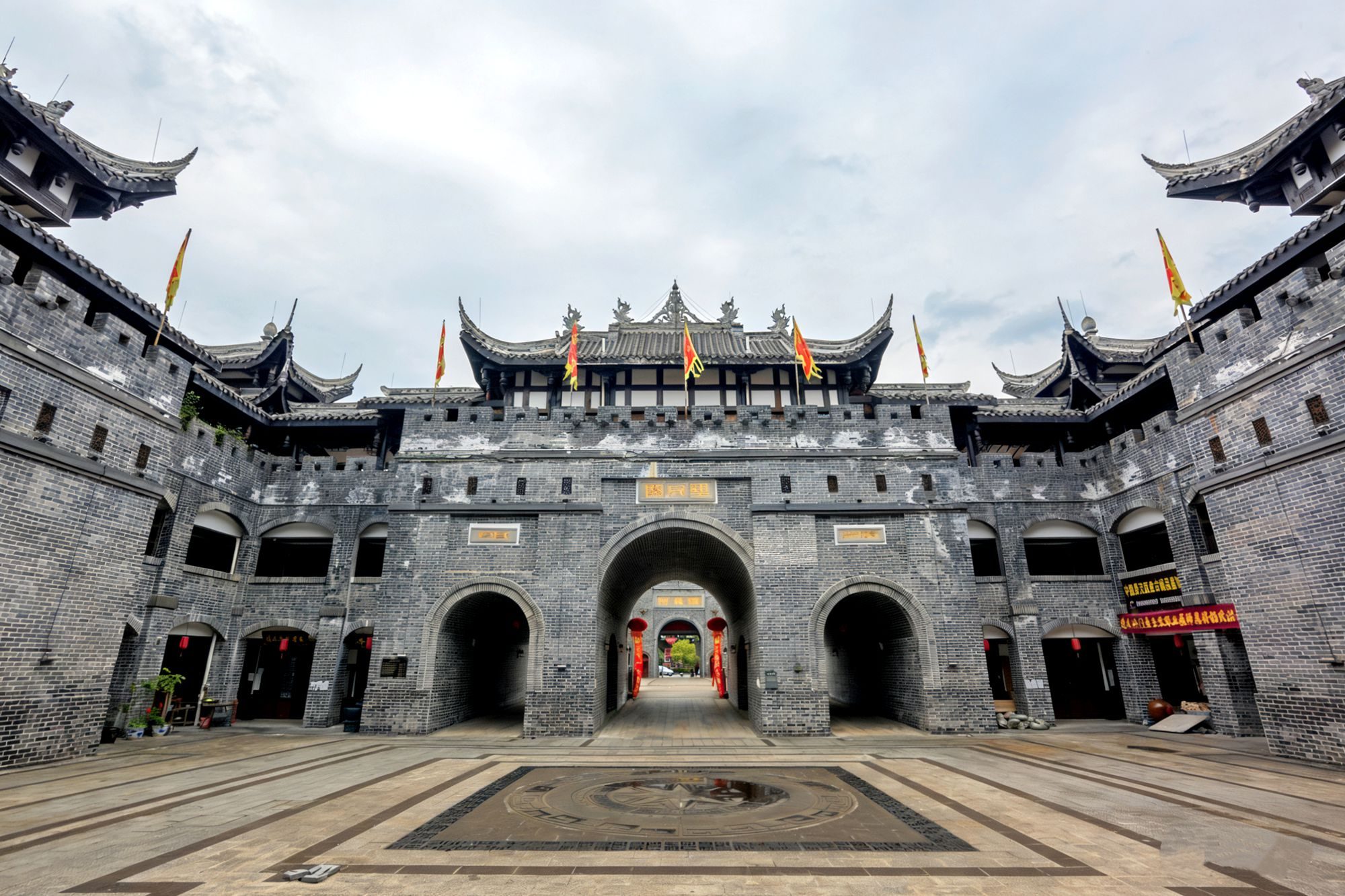 遵义古城完美复刻了古代城池的格局,从城楼走进便到了瓮城。环形石砌城墙围合出开阔广场,多重拱门层层递进,站在瓮城中,仿佛穿越回古代的军事重镇,感受到古人军事防御上的精巧心思。