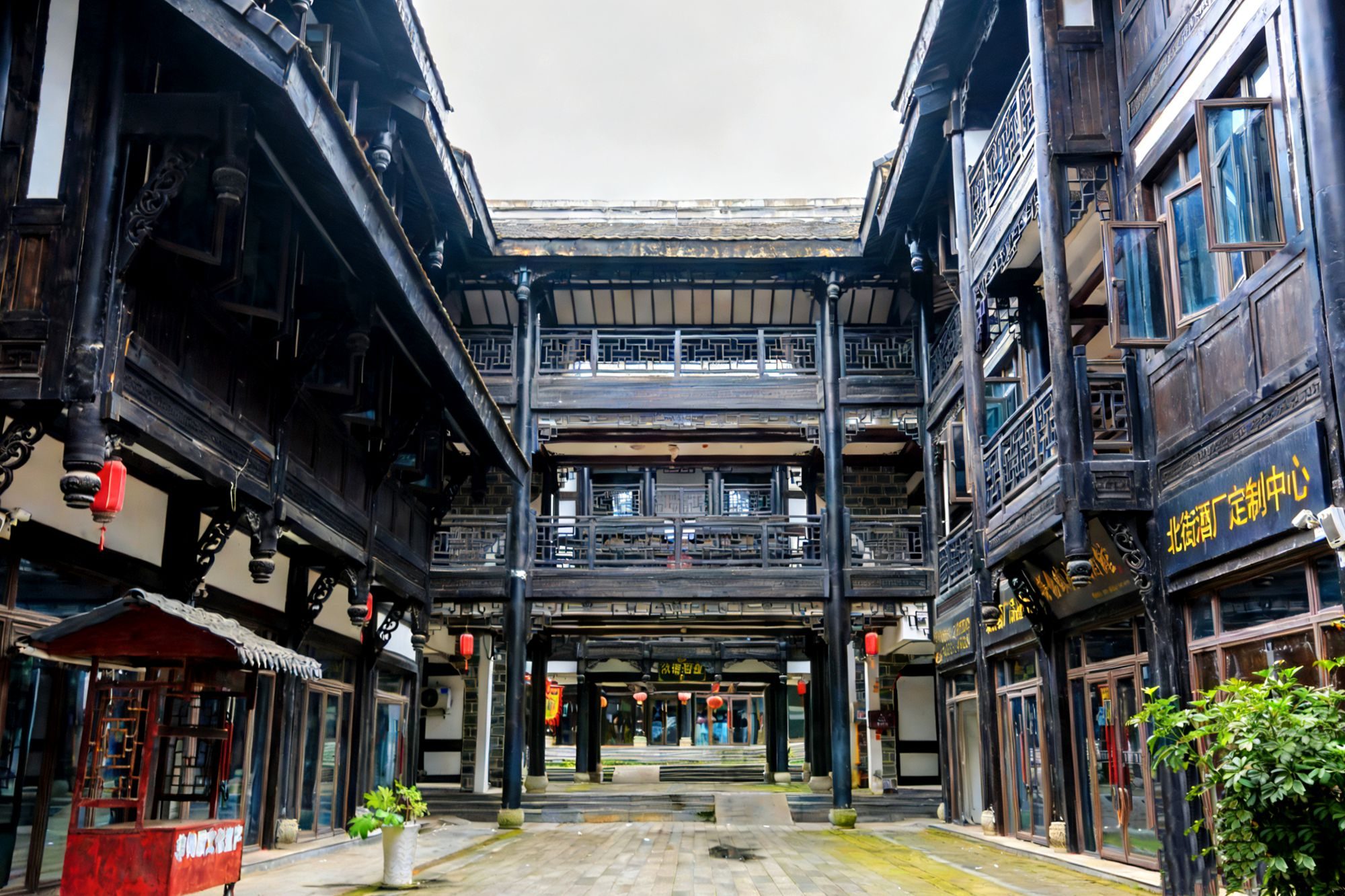 深色的木构梁柱、雕花的栏杆,木质四合院院落层层递进,里面是手工作坊、文创店、展馆,可以尽情体验当地蜡染、银饰锻造等非遗技艺,了解土司文化、酱酒文化等。