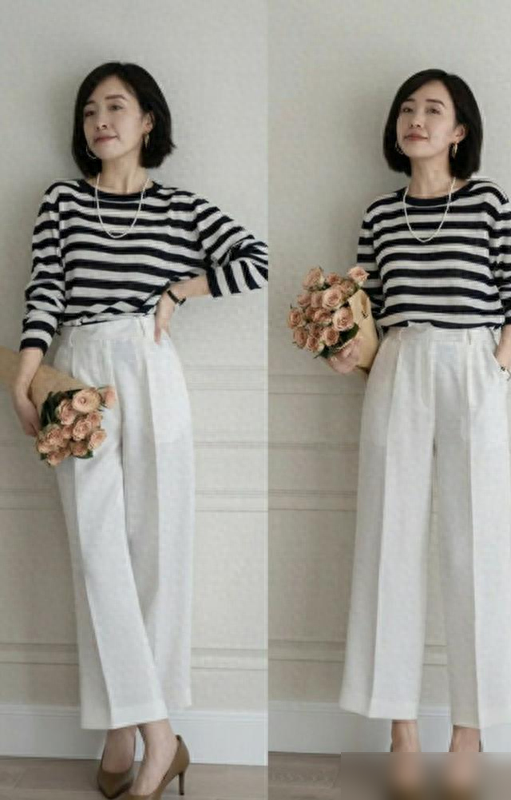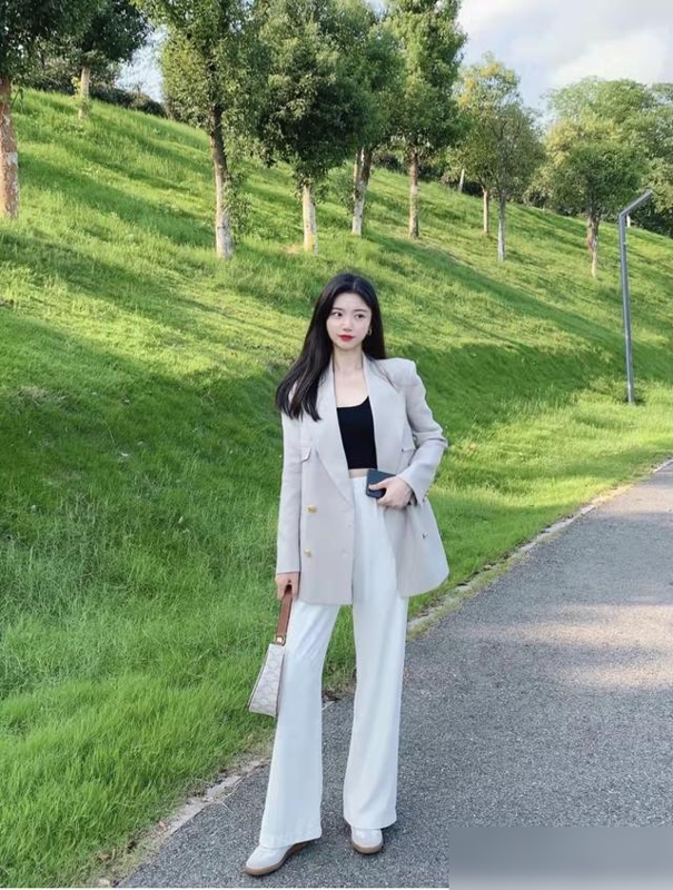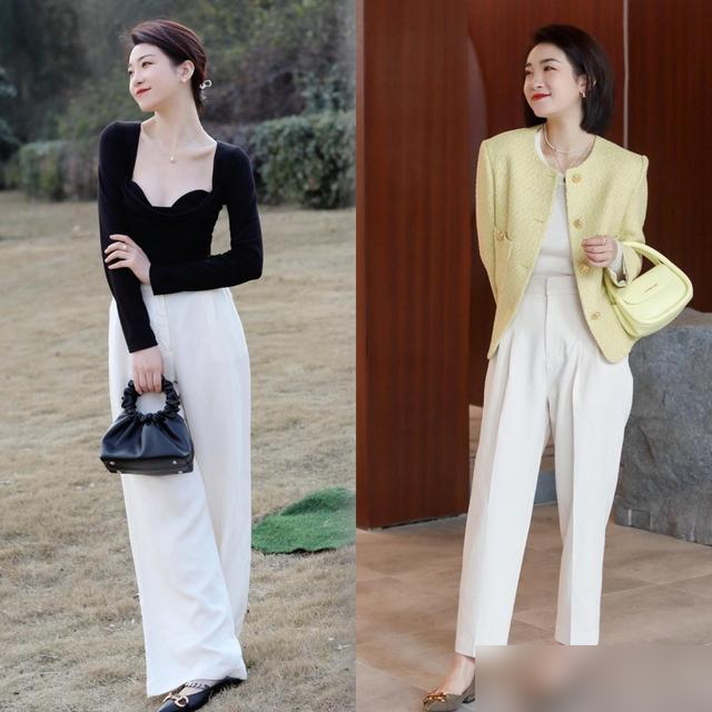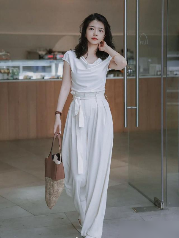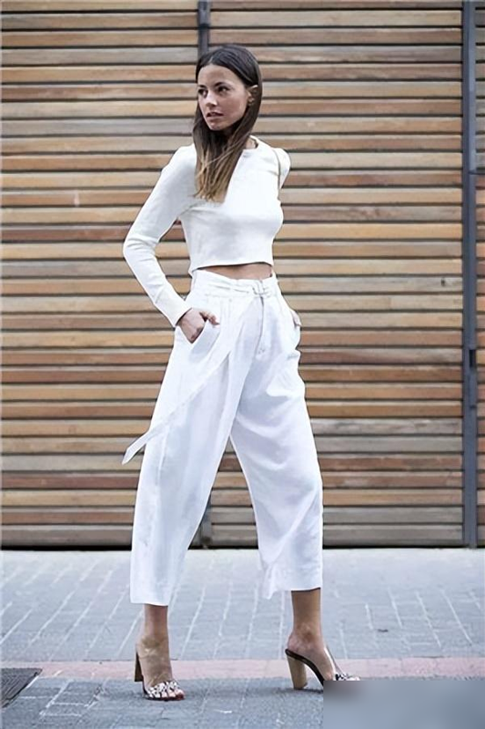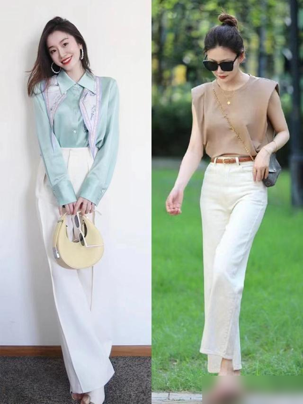 紧身白裤最容易暴露腿型缺陷,尤其是O型腿、假胯宽的女生,穿上像“给腿贴了层保鲜膜”。而真正的“豆腐裤”多采用高腰直筒或阔腿版型:高腰设计能把腰线提至肋骨下,五五分身材秒变三七分;直筒/阔腿的裤管则像“隐形滤镜”,大腿肉、小腿粗都能藏得自然,微胖女生穿也显利落。