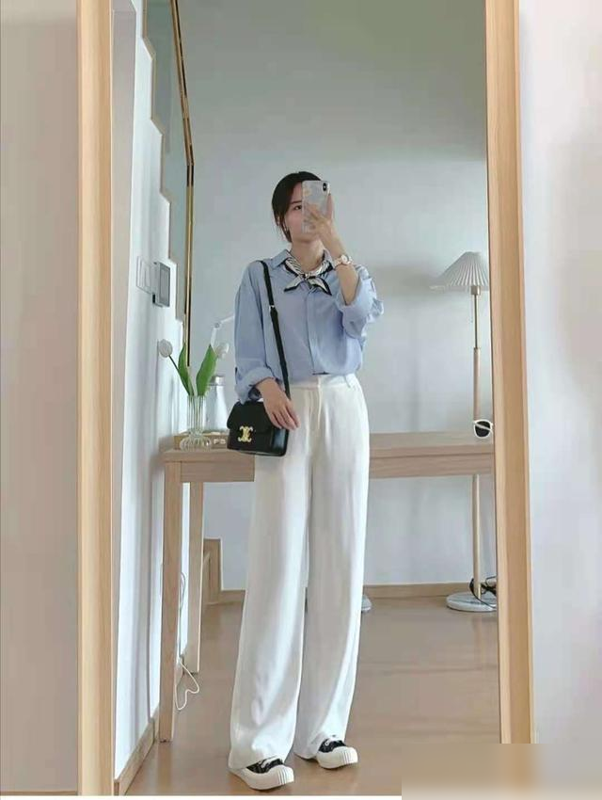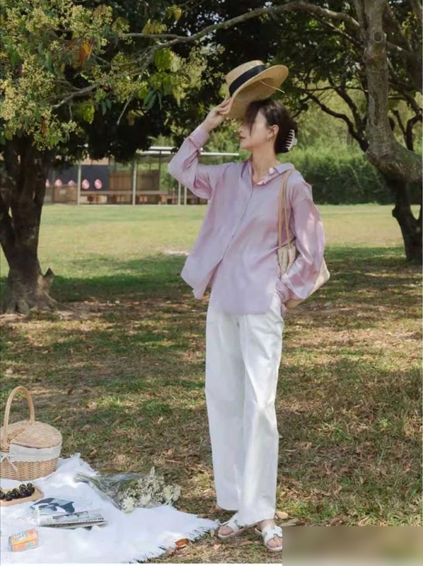 日本穿搭博主三木经常用“衬衫+豆腐裤”出街:浅蓝/米白的雪纺衬衫松松扎进裤腰,露出一截纤细腰肢;裤脚微微卷起,露出脚踝;再背一只草编包,整个人像夏天的风一样温柔。这种搭配的关键是“上紧下松”:衬衫选修身款突出线条,豆腐裤选宽松款平衡体积感,职场通勤、周末约会都能穿。
