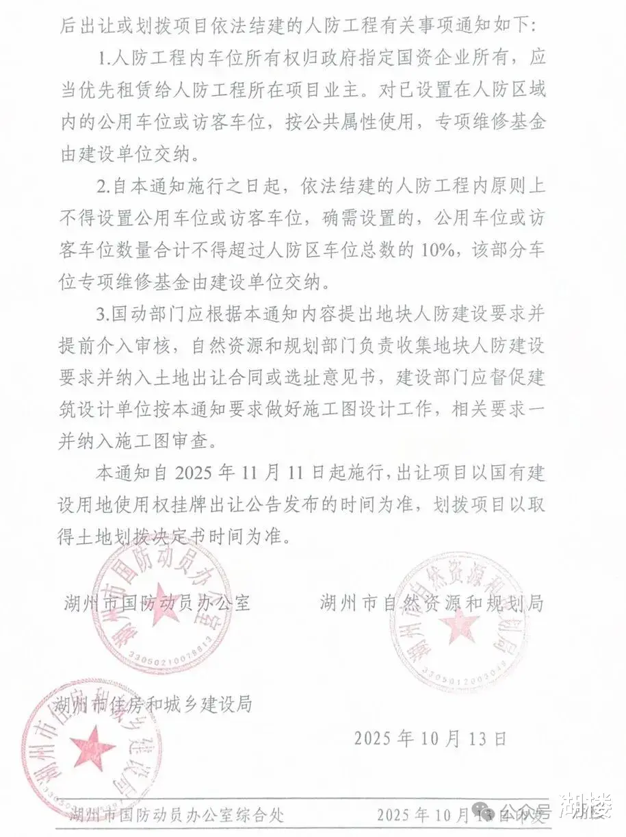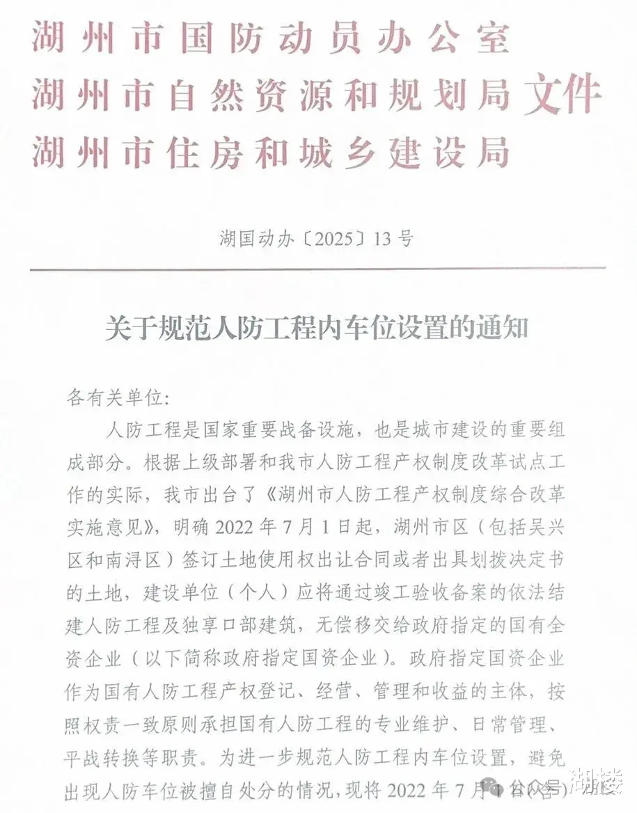 近日,湖州市国防动员办公室、湖州市自然资源和规划局、湖州市住房和城乡建设局关于规范人防工程内车位设置的通知发布。