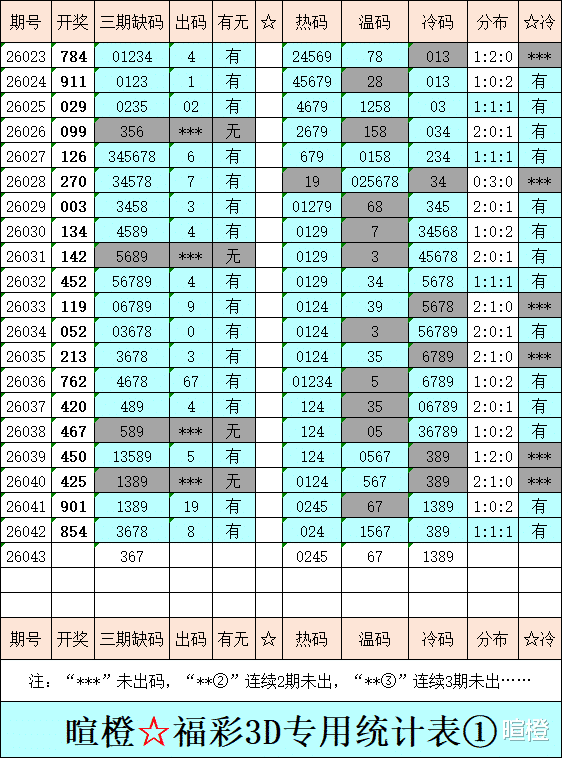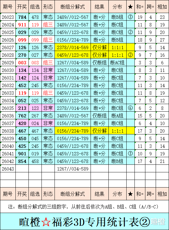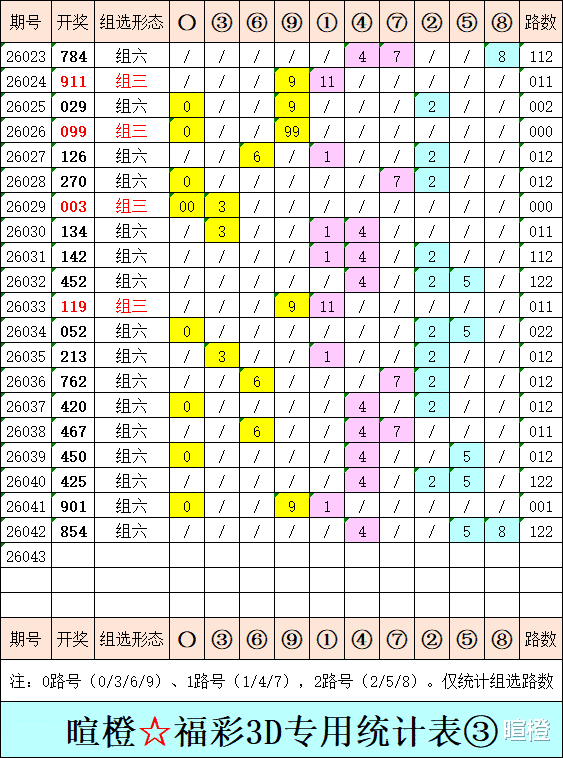 26043期:暄橙福彩3D综合条件(本期将在2月12日21:15开)一、上期回顾 ☆1、上期开奖号:8 5 4。2、和值= 17,跨度= 4。3、常态组六,122路组合。4、热度分布(热:温:冷)1:1:1。二、本期条件 ☆1、三期缺码:367。2、热:0245,温:67,冷:1389。3、断组分解式:1267//034-589。4、四胆:0458;三胆:048。三、术语解释 ☆1、三期缺码:0至9这十个自然数当中,未在近三期开奖号出现的数字。2、热度(热温冷):自然数0至9,在近七期开奖号中,出现3次及3次以上的数字,称为热码;出现2次的数字,称为温码;出现1次和未出现的数字,称为冷码。某个数字在开奖号中出现几个,就按几次计算。3、断组分解式:将0至9这十个自然数,分成三组数字,从前往后依次为A组(4码)、B组(3码)、C组(3码),一般情况下,有一组数字不出码,偶尔会有两组数字不出码。A组不出码的情况相对较少。断组为主,分解为辅。4、常态组六号码:同时包含大数、小数、奇数、偶数、质数、合数的组六号码,共有72注。统计表中,简称“常态”。5、非常态组六号码:全大数、全小数、全奇数、全偶数、全质数、全合数等六种形态的组六号码,共有48注。统计表中,简称“非常”。★提醒:彩市有风险,参与须谨慎!水平有限,仅供参考!