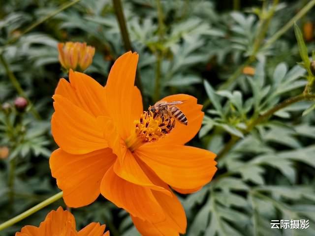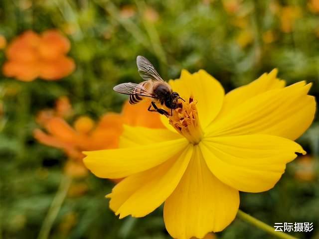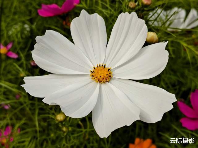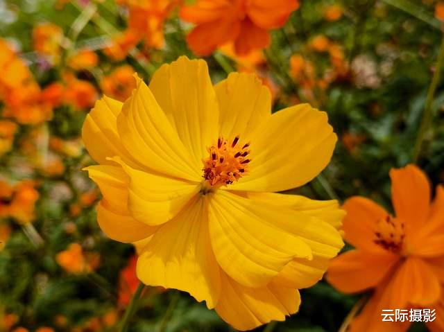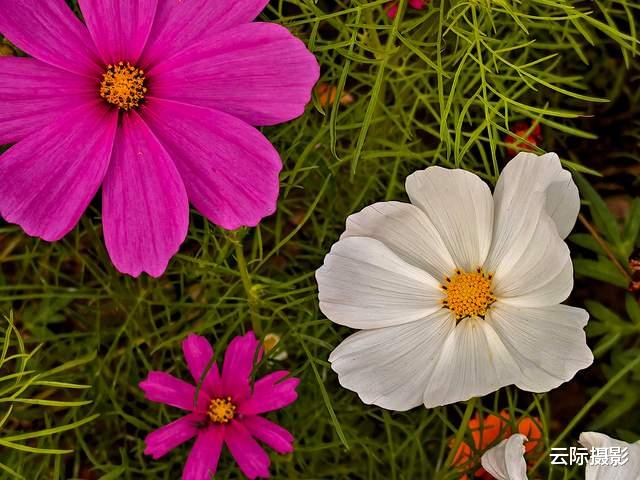那金灿灿的黄秋英如同跳跃的阳光碎片,在微风中闪烁着温暖的光芒;粉紫色的格桑花随风摇曳,其中白色花瓣纯洁如初雪,粉色花朵温柔似朝霞,橙色花团热烈若火焰。