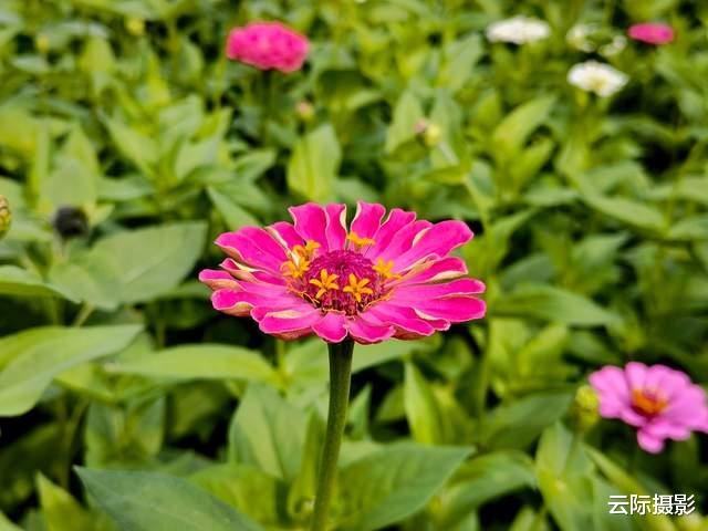 与之相映成趣的百日菊更是不甘示弱,层层叠叠的花瓣呈现出油画般的饱满质感,从花心到花瓣边缘渐变的色彩像是被大师精心晕染过,深浅不一的紫红、鹅黄与玫红相互交织,宛如大地艺术家以天地为画布创作出的震撼杰作。