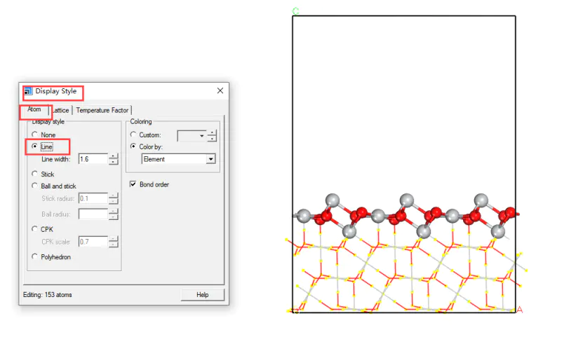 结构,可以得到表面原子为球棍模型,深层原子为线型模型的结构图
