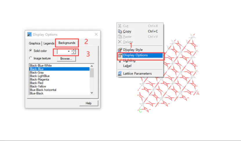 1.使用Materials Studio软件打开表面结构模型,本教程以TiO22.在右边的3D可视化窗口右键选择Display Options,在打开的Display Options窗口中选择Backgrounds选项卡,并在Solid color处选择白色,将可视化从窗口的背景设置成白色。