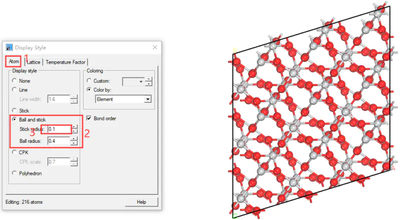 4.在Display Style窗口中选择atom选项卡下面,选择Ball and stick并将Stick radius设置成0.1。