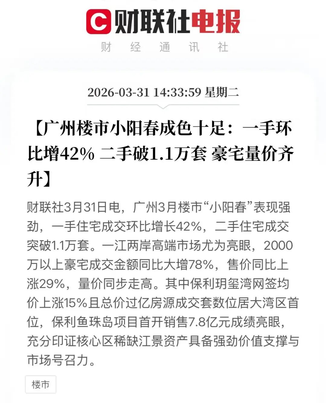 今天是3月31日,2026年第一季度即将结束,相信没有任何人,会怀疑广州楼市回暖的成色。