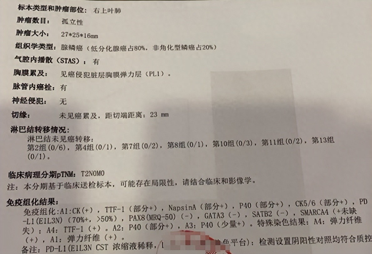 从病理报告来看,患者的癌症类型为肺腺鳞癌,这是一种同时具有腺癌和鳞癌特征的混合型肺癌,相对较为罕见,治疗上也更具挑战性。