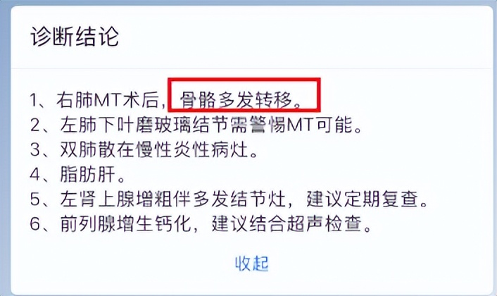 报告中的影像学描述指出,骨骼多发转移,这意味着癌细胞已在多个骨骼处生长。