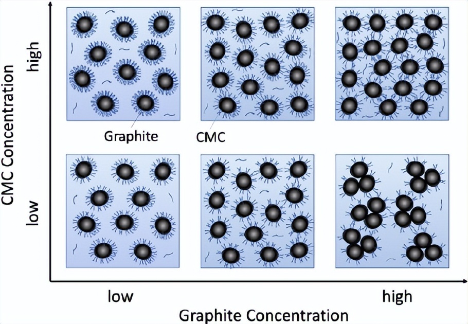 对于石墨、CMC和水体系,微观机制类似。如图5所示,当CMC浓度低(图5的下部)和低石墨浓度时,颗粒表面吸附足够量的CMC,抑制石墨颗粒的聚集。随着石墨浓度的增加,每个石墨颗粒吸附的CMC量减少(图5下中心),颗粒之间的相互作用减弱,低剪切速率区域的粘度降低,高剪切速率区域出现剪切增厚。石墨浓度的进一步增加会导致每个颗粒上吸附的CMC量进一步减少,使得石墨颗粒之间的相互作用减弱并发生聚集(图5右下角),导致粘度增加和数据波动。在CMC浓度升高时(图5上部),即使石墨浓度较高,也能有足够的CMC被吸附在石墨表面,分散石墨颗粒。因此,粘度不会显着增加,并且在高剪切速率范围内也抑制了剪切增稠。分子量最高的CMC提供了更强的空间位阻相互作用,因此对粘度和剪切增稠的影响更大。