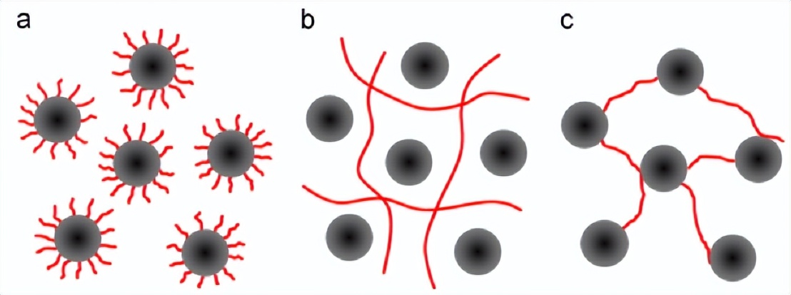 聚合物与颗粒的相互作用,除了包覆(图6a)之外,还包括(b)粘结剂相成三维网络结构,空间位阻作用阻止颗粒的团聚;(c)粘结剂与活性物质颗粒表面键合作用,将颗粒之间连接在一起,这是浆料形成凝胶结构,粘度比较高。