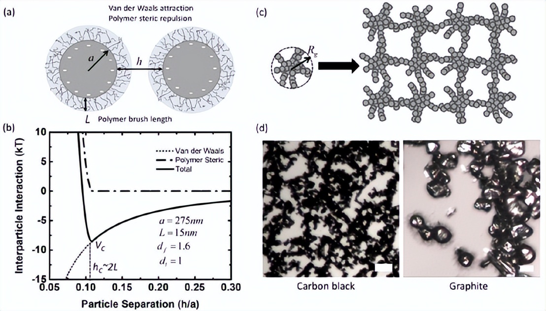 图3 颗粒间的胶体相互作用和颗粒的组装行为。(a)炭黑颗粒的聚合物涂层和颗粒间胶体相互作用的示意图。(b)包覆了PVDF的两个炭黑颗粒之间的典型颗粒间作用力。(c)组装成二次聚集体的初级炭黑颗粒的示意图,这些聚集体连接成网络。(d)炭黑(左)和石墨(右)颗粒的光学图像。