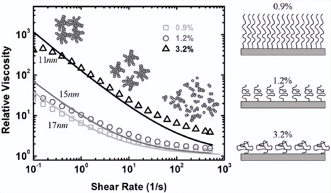 图4 三种不同颗粒浓度的炭黑和PVDF浆料粘度的实验结果,右侧示意图显示了三种不同颗粒体积分数下炭黑表面上PVDF的形态。