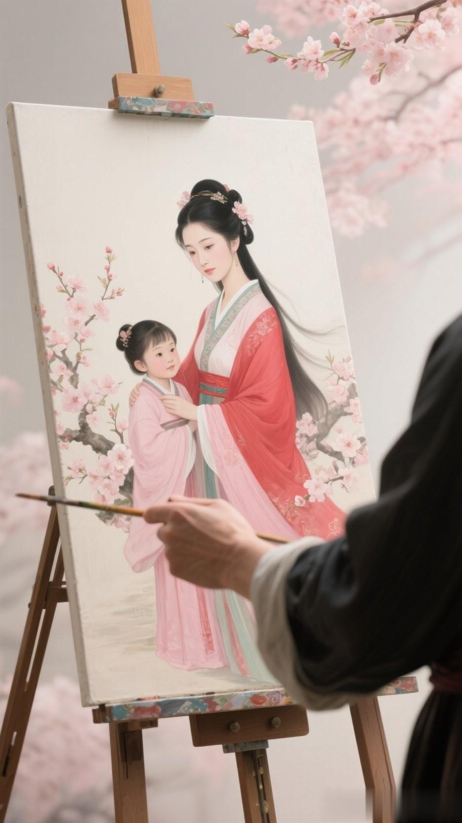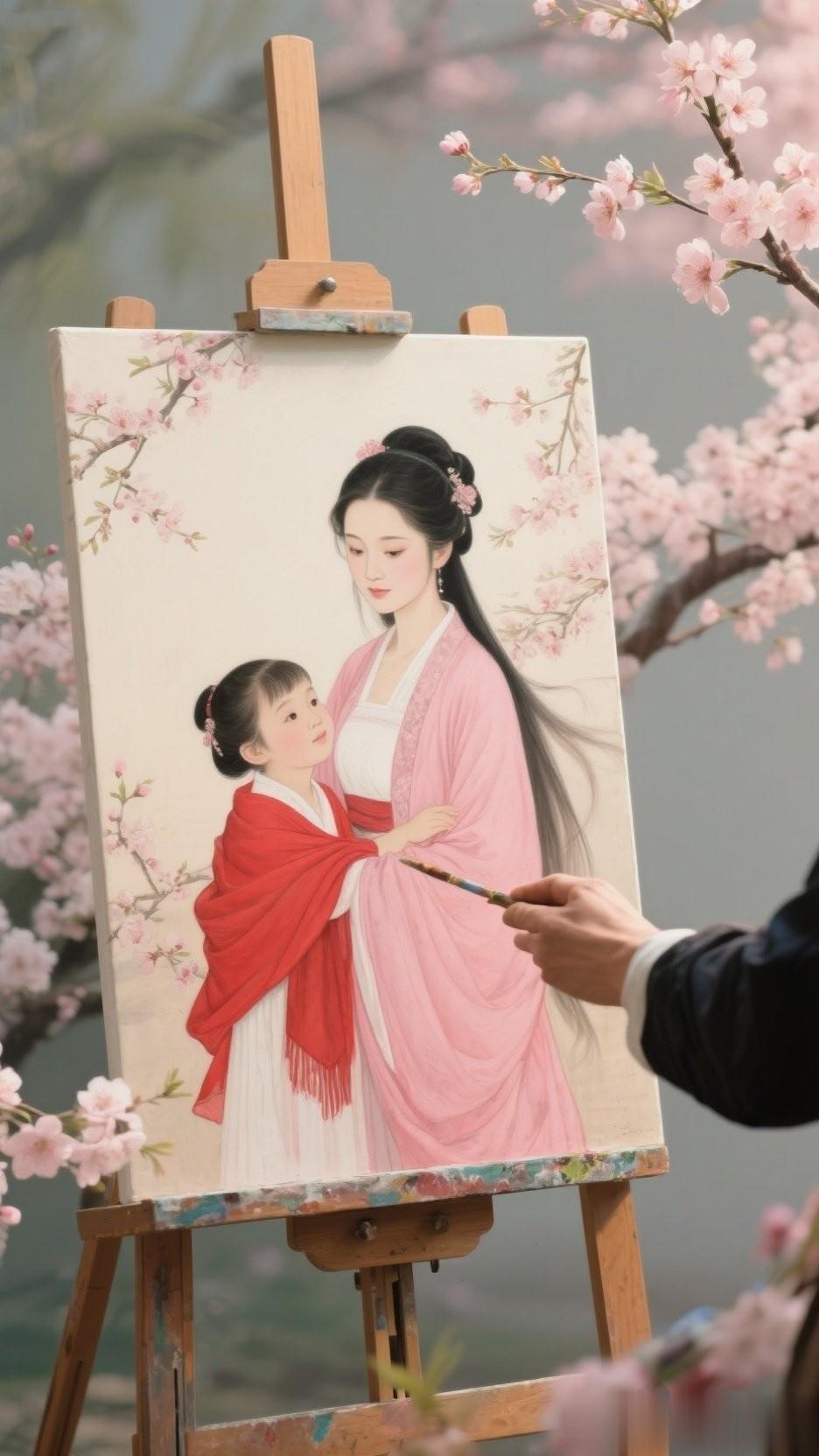 从色彩的运用上看,整幅画的色调温暖而和谐。画家主要采用了暖色系,如柔和的黄色、温馨的橙色和沉稳的棕色。黄色如同阳光洒在画面上,象征着母爱的光辉,它照亮了孩子成长的道路;橙色则像是母亲心中那团炽热的爱火,永不熄灭,时刻温暖着孩子;棕色作为画面中的辅助色,多用于描绘母亲的服饰或者背景中的某些元素,它给人一种稳重、可靠的感觉,就像母亲的爱,是孩子可以依靠的坚实后盾。这些色彩相互交织、渗透,营造出一种浓郁的家庭氛围,让观者仿佛置身于一个充满爱的家庭场景之中。