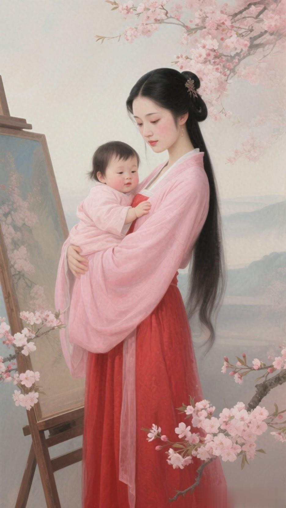 再看画面的构图,画家采用了一种紧凑而富有动感的构图方式。母亲和孩子的身体紧密相连,形成了一个有机的整体,没有丝毫的疏离感。母亲的手臂环绕着孩子,像是一道保护的屏障,这种环抱的姿态充满了力量感,它是母爱的外在表现形式。同时,画面中的线条流畅而自然,从母亲的发丝到孩子的轮廓,每一条线都像是有生命一般,它们共同勾勒出这对母子之间深厚的情感纽带。