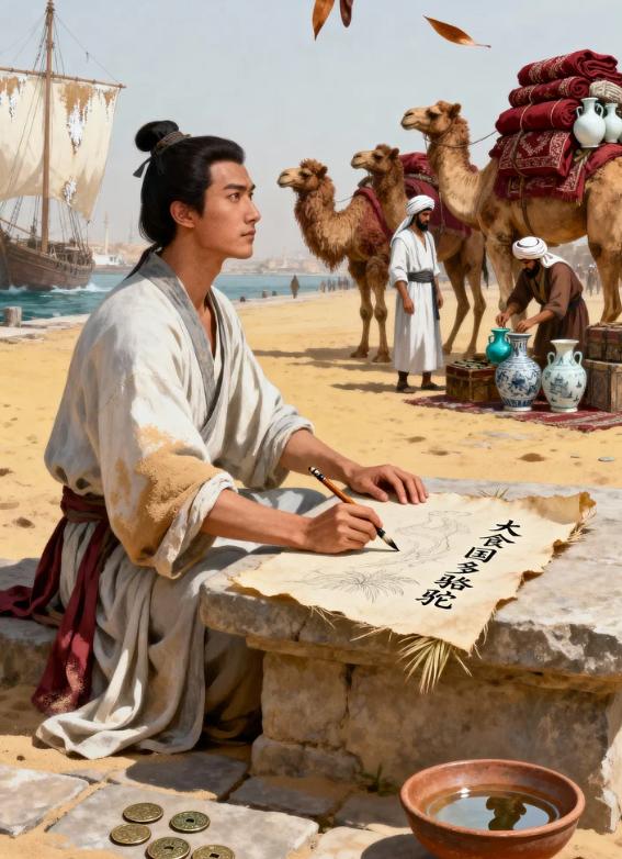 笔蘸椰汁,纸记殊方。天宝十年(751年)的巴士拉港,咸涩的海风裹着乳香与没药的气息,吹过三十二岁杜环的案头。他身着洗得发白的唐式襦衫,袖口还沾着怛罗斯战场的沙尘,指尖握着从战俘营中寻得的半截狼毫,在粗糙的棕榈纸上缓缓落笔——纸上“大食国多骆驼,以椰枣为粮”的字迹刚显轮廓,不远处阿拉伯商队的驼铃便叮当作响,驼背上堆叠的丝绸与瓷器,恰是来自他魂牵梦萦的长安,让这异域港口的风,都染上了几分故乡的温度