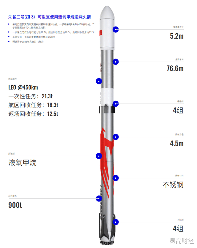 朱雀三号的起飞推力达900吨,能将21.3吨载荷送入近地轨道。