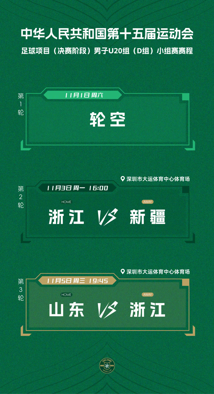 浙江队在广东肇庆进行赛前集训后赴深圳参加第十五届粤港澳全国运动会男子足球U20组别决赛阶段的比赛。