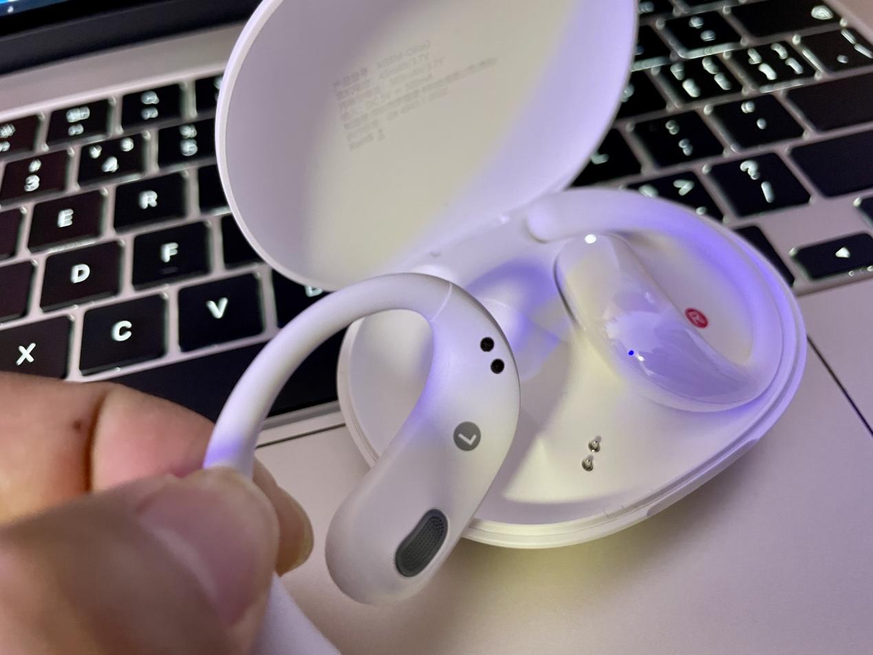 耳机本体采用了开放式耳挂设计,线条流畅,造型简约时尚。我入手的是白色款,亮面烤漆工艺,看起来非常干净清爽,适合各种穿搭风格。耳挂部分采用了亲肤材质,触感舒适,像我这种戴眼镜的,佩戴时也不会显得突兀。