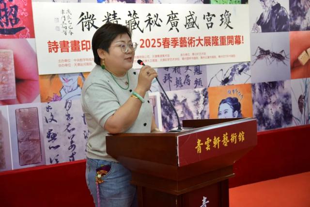 中数字书画频道天津工作中心张钰琳主任上台致辞,针对天津市艺术家对工作中心多年来的鼎力支持表示感谢,同时希望今后天津书画界能涌现出更多有才华的有生力量,创作出更多更好的优秀作品,大家为天津书画艺术的发扬光大共同努力。