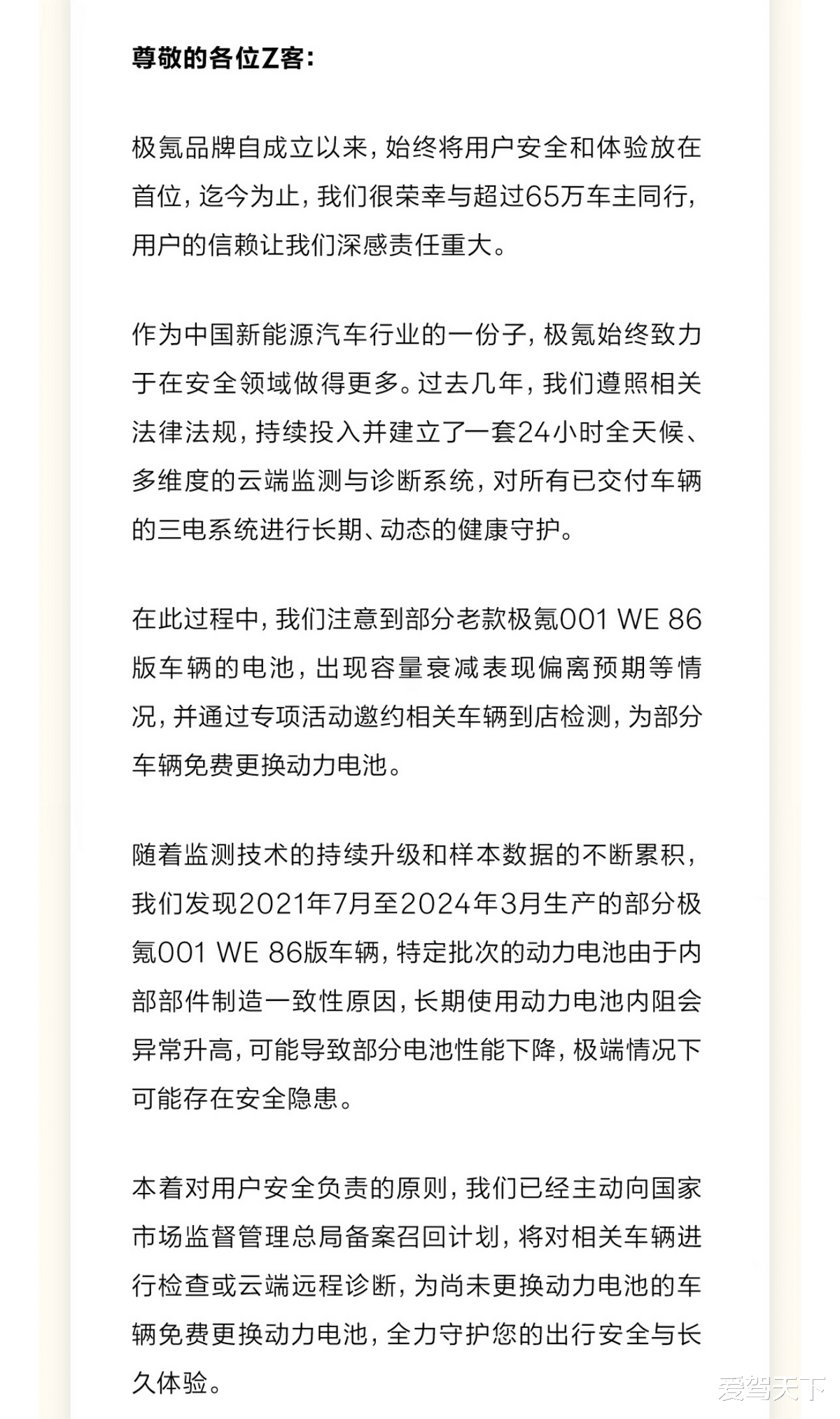 值得一提的是,这个结论是极氪通过24小时云端监测系统,对自己累计交付的近65万辆车,逐个监测三电系统的运行数据,长期跟踪下来才得出的精准判断。其实在这次大规模召回之前,极氪就已经通过云端数据,发现有一部分老款极氪001 WE 86版车主,反馈电池容量衰减得比正常情况快,当时极氪就搞了专项服务,主动约这些车主到店检测,已经给一部分车辆免费换了新电池。