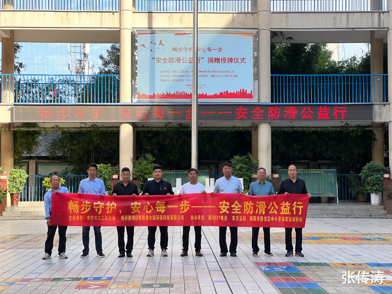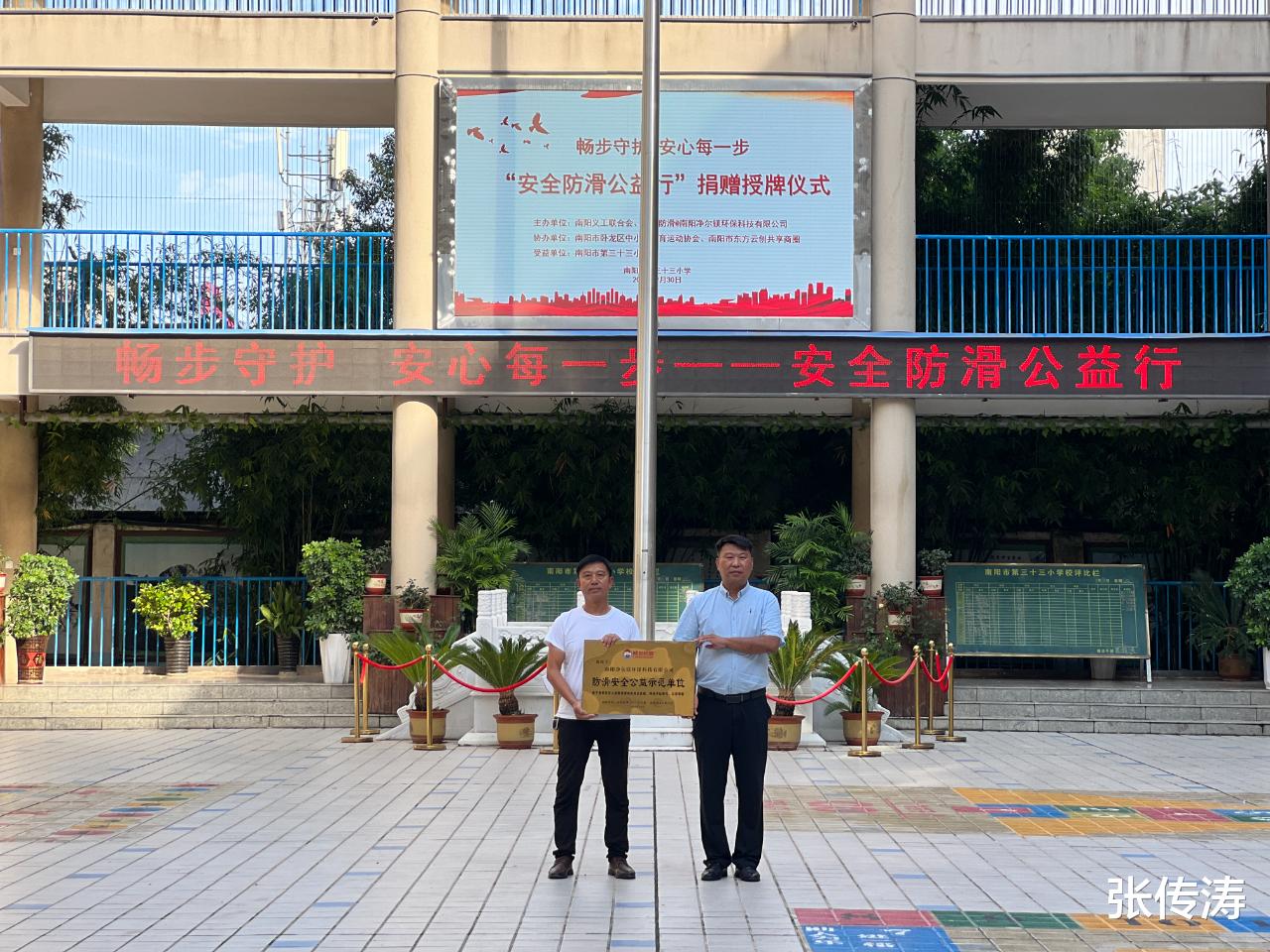 活动现场,该校领导、南阳市义工联合会代表及畅步防滑公司代表等相关人员悉数出席,师生代表整齐列队,共同见证这份暖心之举。仪式伊始,畅步防滑公司代表首先登台,简述了此次公益行动的核心意义——校园地面湿滑是师生出行的隐形隐患,尤其对于活泼好动的小学生群体,防滑保障更是校园安全的重中之重,希望通过专业的防滑施工,为孩子们营造一个“走得稳、行得安”的学习环境。