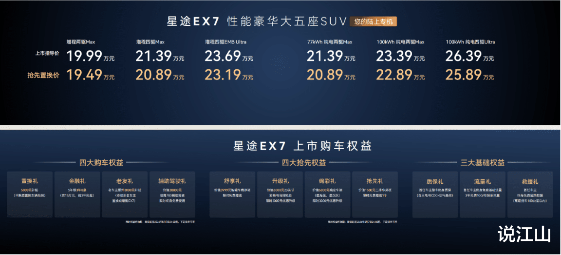 4月19日,珠海国际会展中心,星途品牌3.0时代开山之作——星途EX7正式全球上市。新车定位“性能豪华大五座SUV”,提供纯电与增程双动力,共六款车型,官方指导价19.99万元—26.39万元,抢先置换价19.49万元—25.89万元。