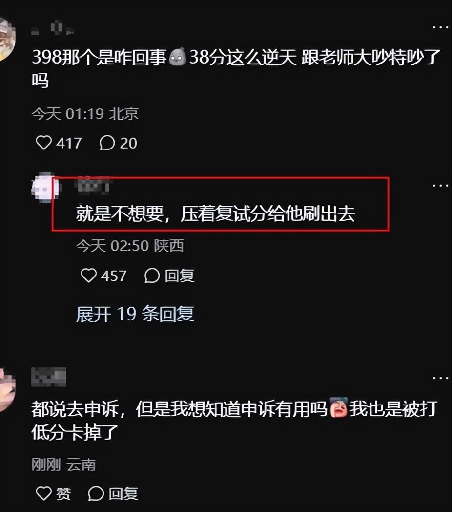 他只能说就是因为学校不想要自己,但是给他打了个决定性的低分之后,让他连校内调剂的机会都没有,直接断了这位女同学一整年的后路。