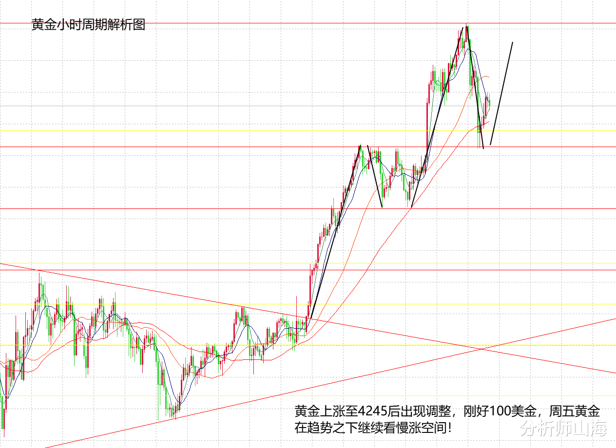 这波黄金上涨从3900起步,到周四最高4245,基本完成了山海对这波黄金看涨的预期,中长线看到4300,上方只差50美金,不过山海也强调过,这个周期看涨中间4250也有一定的压制,所以,周四亚欧盘在开盘慢涨后就直接到了接近4250高点,在相对走势中,美盘又刚好在4245开始下跌,上下走出100美金力度,最低在4145,现在回顾来看,其实这种走势比较符合市场的运行规律。那么,经过周四的下跌,周五黄金大概率也就是一个震荡上行的走势,在多头趋势不变的情况下,继续看上行空间即可,不过不要过分看涨。从技术面来看,其实日线的上涨空间并没有走完,这波至少看到4300才可能结束,而实际在4245开始下跌,那么尊重市场,在日线首次收阴后就不要过分看上涨空间,H4周期就不一样,经过回落调整,但没有破位布林中轨支撑点,所以还是绝对的强势,今天在中轨之上看涨的话,继续看上方4250,4300,4250不破就以短线看待,4250破位再看4300本周目标点。小周期的话,今天关注关键支撑做多即可,早盘回落至4170后上涨,日内激进的话就以此支撑做多,如果意外继续下行,就以4150支撑做多,耐心等待周五的上涨空间,当然,刚刚讲过,周五看震荡慢涨走势,上涨后不管是4250还是4300均可根据实际是否破位考虑做本周的回落空间。
