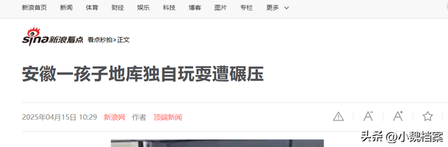 ( 信息来源:新浪网 2025年04月15日 —— 安徽一孩子地库独自玩耍遭碾压 )