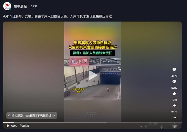 ( 信息来源:鲁中晨报 2025年04月16日 —— 4月15日发布,安徽。男孩车库入口独自玩耍,入库司机未发现直接碾压而过 )