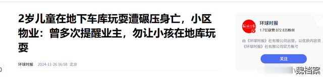 ( 信息来源:环球时报 2024年11月26日 —— 2岁儿童在地下车库玩耍遭碾压身亡,小区物业:曾多次提醒业主,勿让小孩在地库玩耍 )