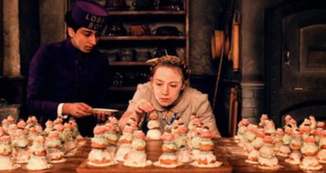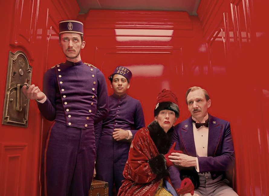 那些饱和度极高的马卡龙色更是暗藏巧思:粉色的酒店外墙像一层柔软的保护壳,包裹着里面熨帖的桌布、锃亮的银器,还有古斯塔夫永远笔挺的燕尾服;而当镜头转向酒店外的街道,色调立刻变得灰暗沉郁,炮弹炸开的烟尘与粉色外墙形成刺眼对比。这种色彩反差,恰是韦斯·安德森的用心——用人工雕琢的“甜”,反衬现实世界的“苦”。