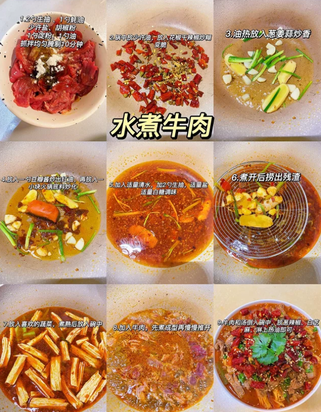 水煮牛肉,这道菜真是既好吃又对身体有益。牛肉是优质蛋白质的来源,含有人体必需的氨基酸,对肌肉的建设和修复至关重要。同时,牛肉还富含铁质,对于预防贫血有显著效果。水煮的方式保留了牛肉的营养,减少了油脂的添加,更适合追求健康饮食的人群。