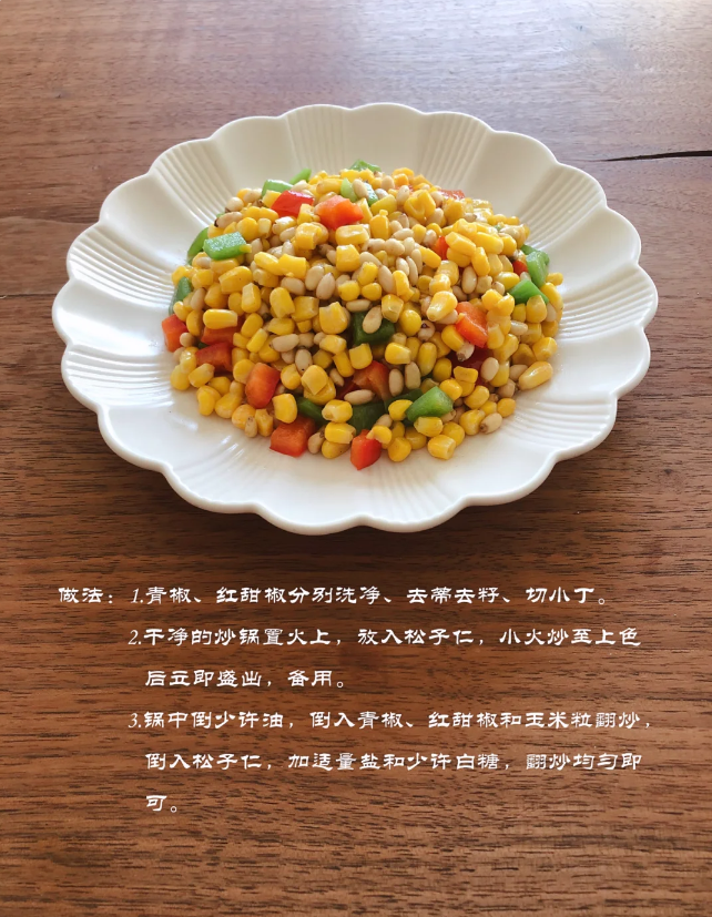 松仁玉米,这道菜色泽金黄,口感丰富,营养价值高。玉米是纤维和维生素B群的良好来源,而松仁则提供了健康的单不饱和脂肪和蛋白质。这种组合不仅美味,还有助于提供持久的能量和促进心脏健康。