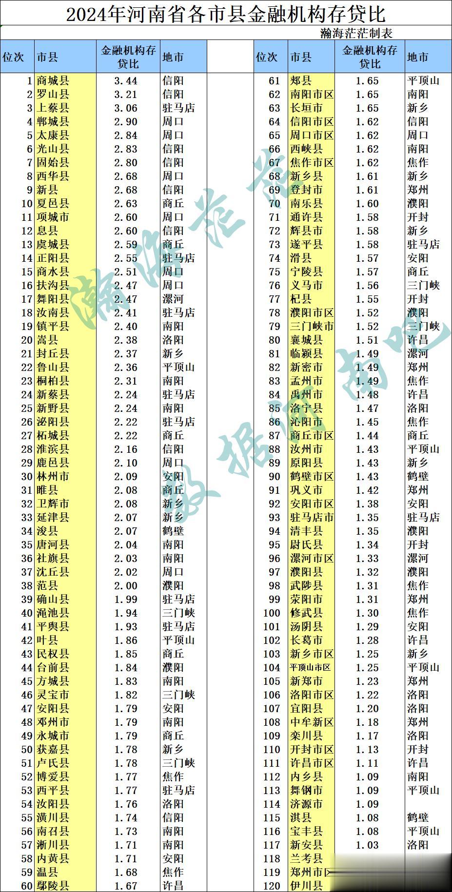 今天,我们来看下2024年河南省各市县金融机构存款余额,贷款余额,存贷比情况。