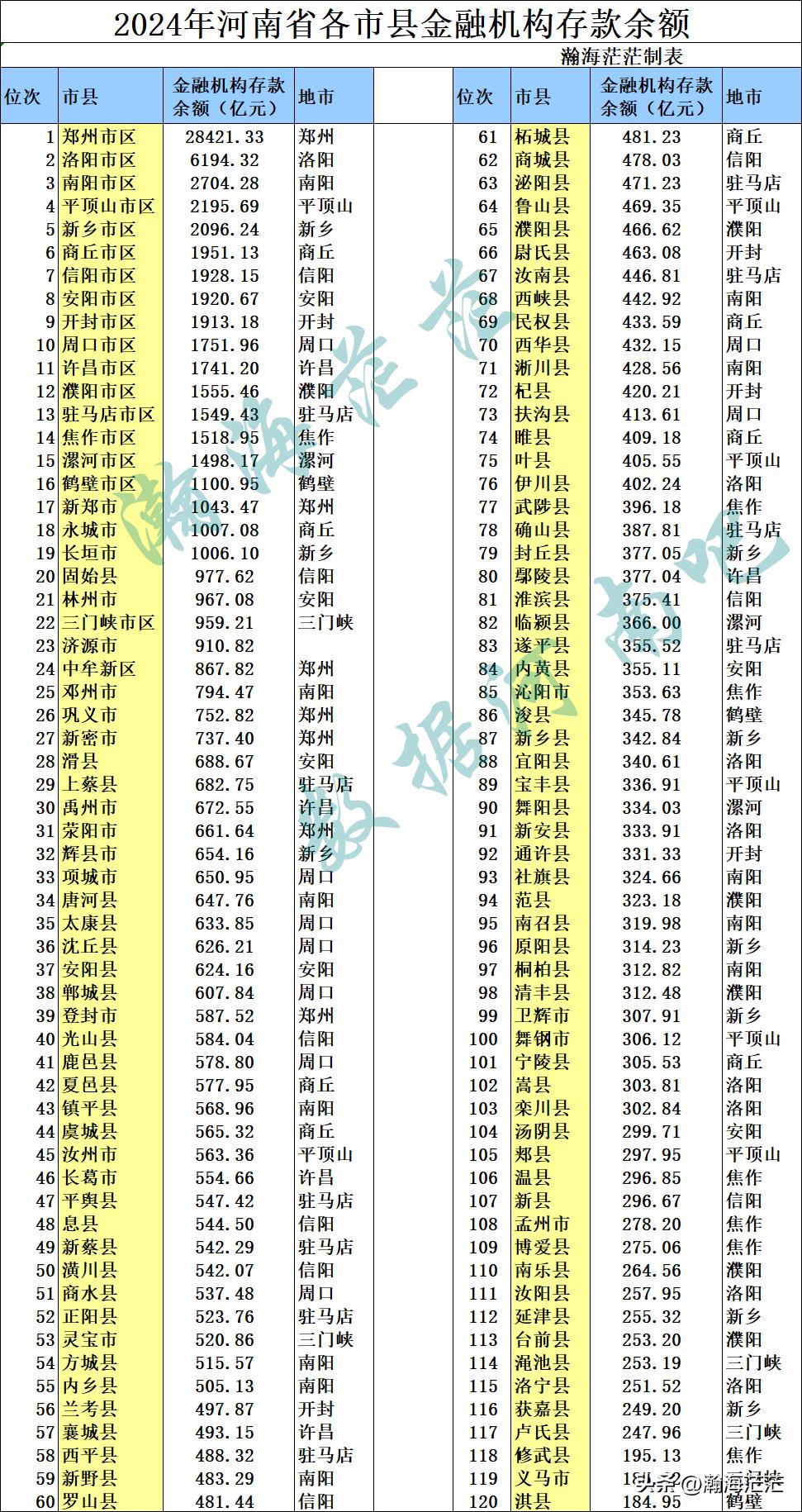 我们首先,来看下2024年河南省120个市县金融机构存款余额情况。