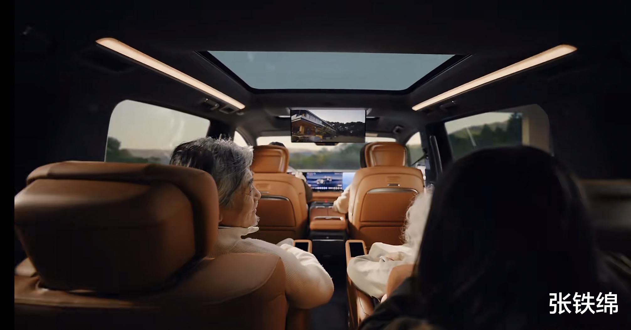 第二排采用了沙发式的座椅,带有双侧座椅扶手,还提供了电动腿托。车顶带有吸顶电视,使用了前后双天窗设计,两侧还带有氛围灯。