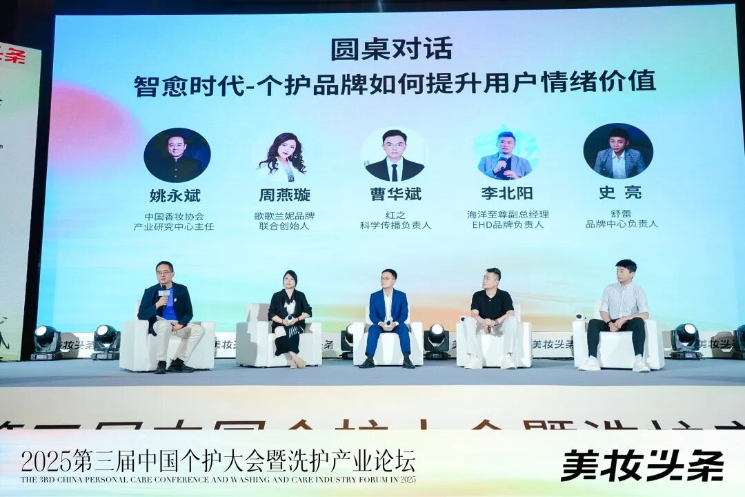 由中国香妆协会产业研究中心主任姚永斌主持的圆桌论坛中,歌歌兰妮品牌联合创始人周燕璇;红之科学传播负责人曹华斌;海洋至尊副总经理、EHD品牌负责人李北阳;舒蕾品牌中心负责人史亮围绕着“智愈时代——个护品牌如何提升用户情绪价值”展开了探讨。