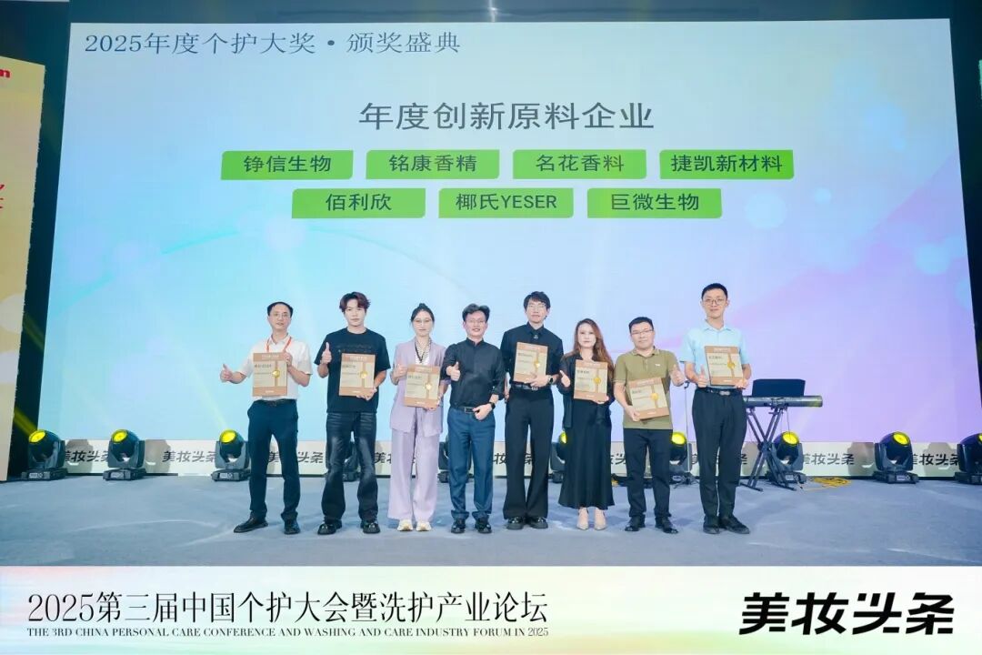 在由美妆头条主办,铭康香精特别赞助的“香聚铭康馨见未来——2025年度个护大奖·颁奖盛典”上,《TOP30消费者偏爱个护国货品牌》(美妆头条X用户说联合发布)、年度创新品牌、年度推荐个护产品、年度优秀服务商、年度创新智造工厂、年度创新原料企业、个护原料创新技术、年度创新包材企业、战略合作伙伴等多个奖项一一揭晓,在觥筹交错中见证榜样力量。