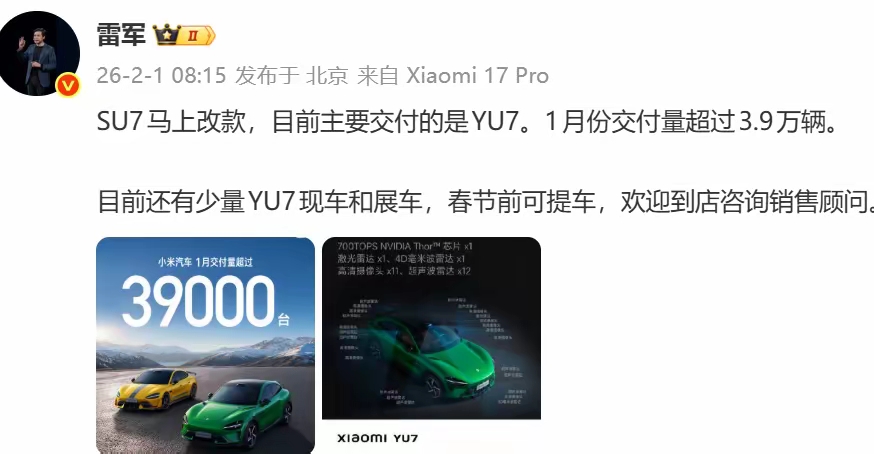就在传闻愈演愈烈、质疑声不断蔓延之际,雷军终于正式回应,在公布小米汽车1月交付数据的同时,明确表态“SU7马上改款,目前主要交付的是YU7”,一句话既印证了产线调整的事实,也揭开了SU7停产背后的真实考量。