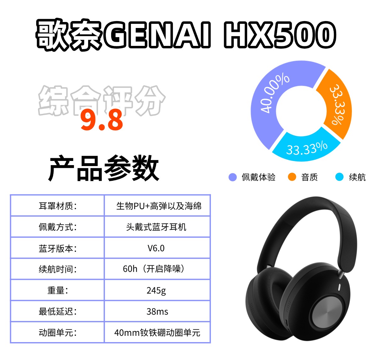 音质:40mm蚕丝复合振膜,三频是均衡的,人声通透、低频有弹性不轰头,GNDSP分频,细节足、耐听不腻