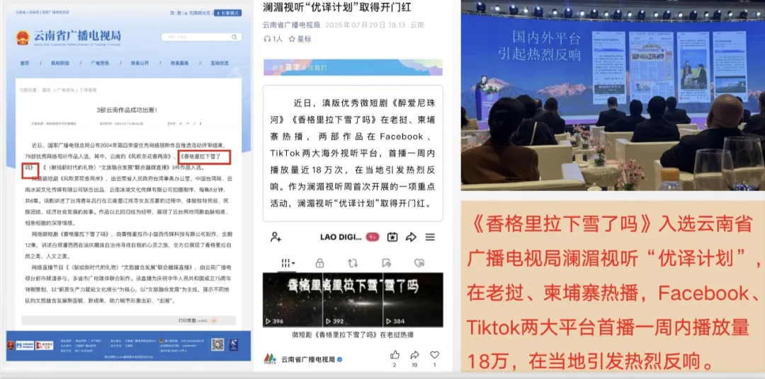 入选云南省广电局澜湄视听“优译计划”,在老挝、柬埔寨热播。在Facebook、Tiktok首周播放量突破18万,引发海外观众对香格里拉的向往。获评海南岛国际电影节“海外传播微短剧案例”,助力迪庆文旅“数字出海”。
