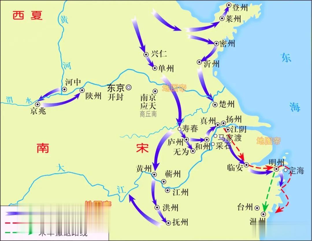 完颜宗弼挥师疾进,渡江后紧追赵构,从建康到临安,从临安到越州,从越州到明州(今浙江宁波),从明州到定海。赵构无处藏身,渡海漂了几个月,次年抵达温州。完颜宗弼誓要斩草除根,搜山检海捉赵构。