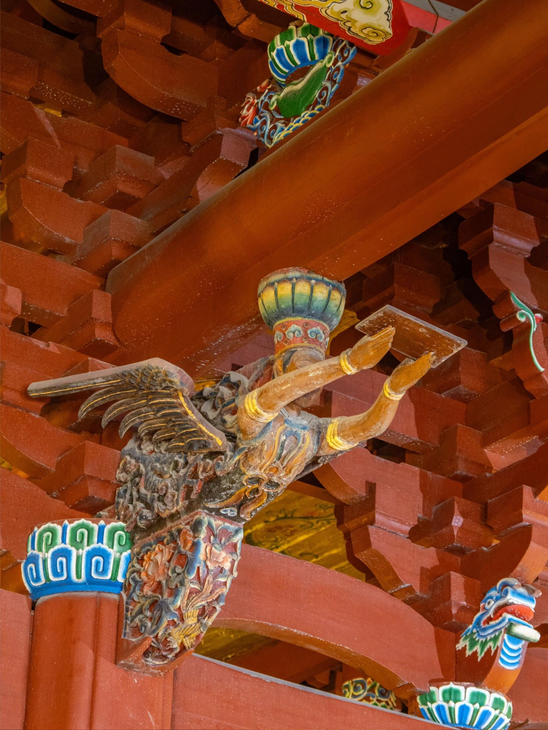 二十四身妙音鸟栖居在正殿的第一跳华拱上,像是被赋予了生命的精灵。它们有的手持南音琵琶,四弦仿佛在微风中震颤;有的轻握洞箫,唇畔似有幽韵流转;最妙的是那执狼毫的妙音鸟,笔尖悬在半空,仿佛下一秒就要在虚空中写下千年风雅。这些木拱原本只是建筑结构的一部分,却被匠人雕琢成“既能承重又会歌唱”的艺术品,当阳光透过殿顶的缝隙斜斜切进来,斗拱的阴影在地面织成棋盘,妙音鸟的剪影便在光影交错间活了过来,仿佛下一秒就会踏响金阶,奏一曲《梅花操》。