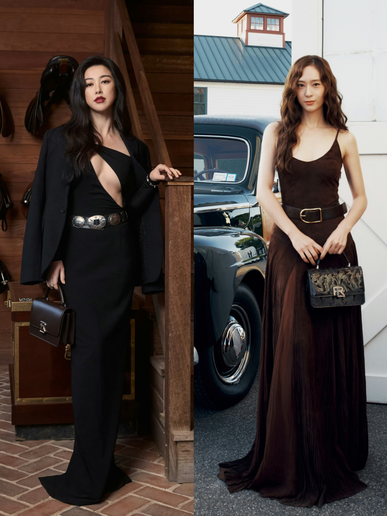 朱珠身披黑色外套内搭性感摩登长裙,all Black展现明媚奢雅姿态;郑秀晶穿深棕色束腰分叉长裙亮相,尽显摩登优雅。