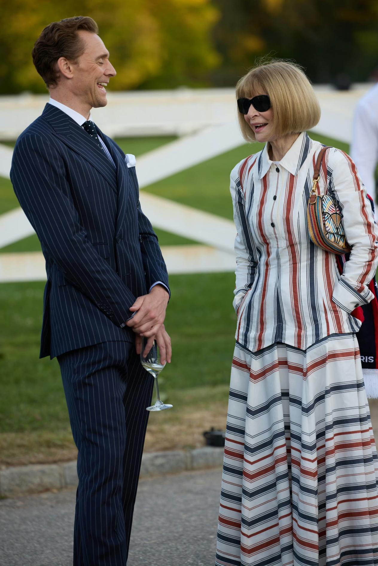 大秀当天,抖森(汤姆·希德勒斯顿)身穿蓝色戗驳领条纹西装,搭配黑色波点领带,展现矜贵的英伦腔调;一袭条纹衬衫长裙亮相的“女魔头”安娜·温图尔,散发着自信笃定的大女主气场。