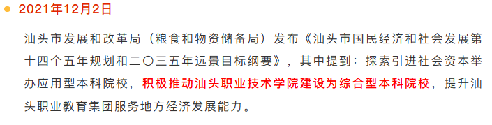 汕头职业技术学院是广东省省域高水平高等职业院校建设计划培育单位和广东省高水平专业群建设学校。目前拥有4个校区招生,不同校区环境差距非常大。学校是广东省高水平专业群建设学校,省域高水平高等职业院校建设计划立项单位,全日制在校生1.47万人。