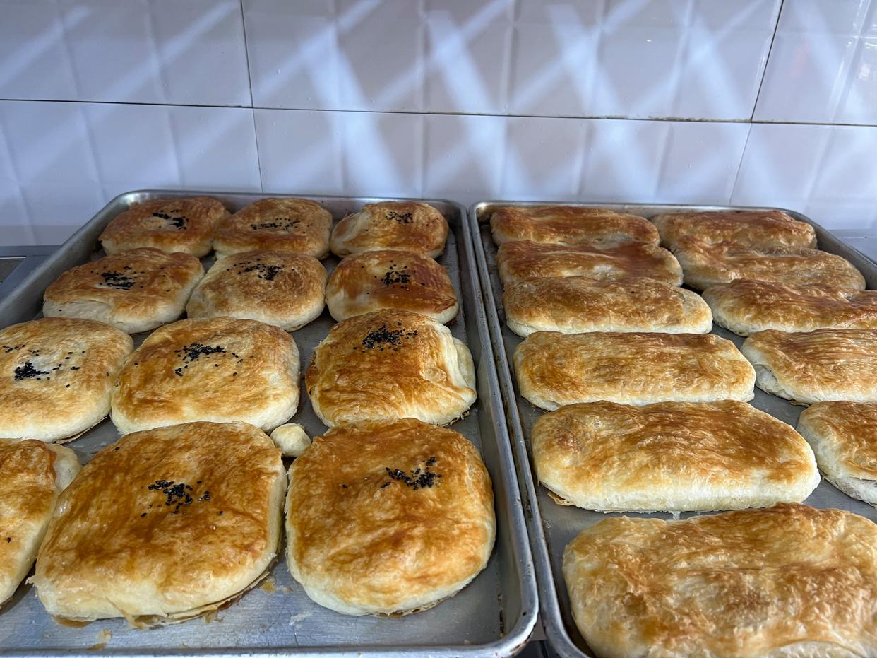 这份对品质的坚守,藏在每一道工序的细节里。烧饼制作沿用古代传统技法,工艺代代传承:面团包裹等量油酥,收口捏紧后按扁擀成圆片,卷成长条下剂再擀制,包入馅料后捏紧收口、轻轻按压,最后均匀粘上芝麻送入烤盘。经过 8分钟左右的烘烤,直至两面微黄,一份色泽淡黄、外观精致、酥松可口且不油不腻的烧饼便新鲜出炉,每一口都藏着老手艺的温度。
